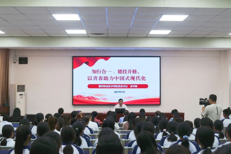 9月20日下午,漯河職業(ye) 技術學院黨(dang) 委書(shu) 記易軍(jun) 鵬以《知行合一、德技並修,以青春助力中國式現代化》為(wei) 題,為(wei) 2023級新生講授開學第一課。