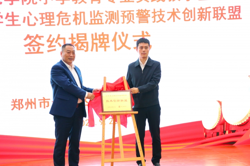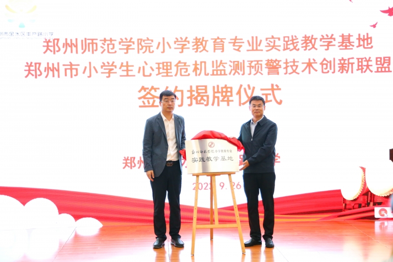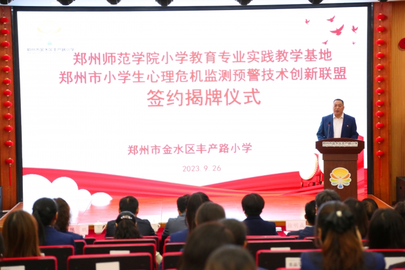 2023年9月26日上午,鄭州師範學院小學教育專(zhuan) 業(ye) 實踐教學基地、鄭州市小學生心理危機監測預警技術創新聯盟簽約暨揭牌儀(yi) 式在金水區豐(feng) 產(chan) 路小學多媒體(ti) 教室隆重舉(ju) 行。鄭州師範學院、金水區教育局和金水區豐(feng) 產(chan) 路小學的相關(guan) 領導出席了本次簽約揭牌儀(yi) 式。