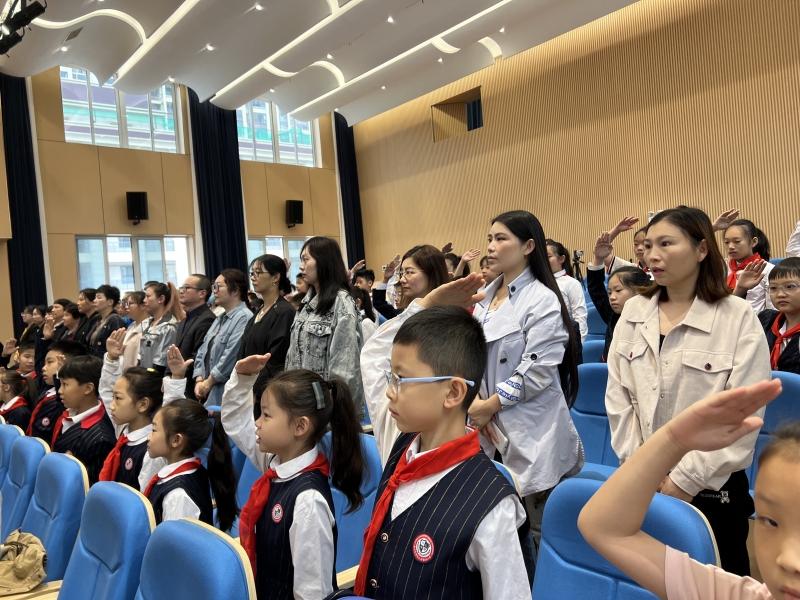 伴隨著國歌聲響起,莊重、肅穆的升旗儀(yi) 式正式開始。參加升旗儀(yi) 式的老師、家長和學生莊嚴(yan) 肅立,激情飽滿,高聲齊唱《義(yi) 勇軍(jun) 進行曲》。
