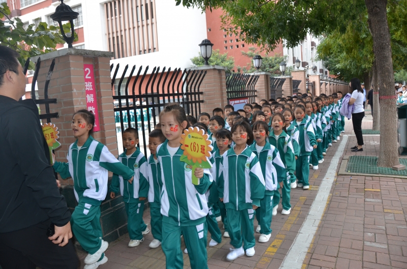路隊管理是學校和班級文明的窗口,關(guan) 係到良好校風、班風的形成和學生的安全。同學們(men) 在班主任老師的帶領下井然有序地列隊前行。領隊的同學吹著響亮的哨子,大家排著整齊的隊伍,個(ge) 個(ge) 精神飽滿,昂首挺胸,步伐鏗鏘有力,口號清脆響亮,有秩序地走至接送點,走出了一年級同學們(men) 的文明形象和素質風采。特別是在路隊展示中,接孩子的全體(ti) 家長被孩子們(men) 在入校還不足一個(ge) 月的短短時間裏,就能做到不僅(jin) 隊伍整齊、口號響亮,還能把《社會(hui) 主義(yi) 核心價(jia) 值觀》《中小學生守則》《弟子規》《三字經》背誦得有模有樣而深深吸引,接孩子的家長隊伍中不時響起陣陣的熱烈掌聲和朗朗的笑聲。從(cong) 細節處見文明,在小事中顯美德。規範的路隊管理不但增強了學生安全意識,解決(jue) 了放學擁堵散亂(luan) 現象,促進了學生良好文明習(xi) 慣的養(yang) 成,也為(wei) 我校全國文明校園增添了靚麗(li) 的色彩。