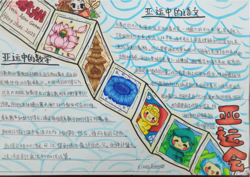 除了關(guan) 注比賽最新時訊,在亞(ya) 運會(hui) 選手的奪冠瞬間而歡慶鼓舞之外,同學們(men) 還通過多種渠道了解亞(ya) 運的精神內(nei) 涵,並以一幅幅主題鮮明、形象生動的亞(ya) 運手抄報展示了對亞(ya) 運的熱情。