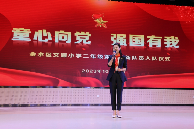 金水區文源小學黨(dang) 支部書(shu) 記、校長黃延穎寄語新隊員。希望他們(men) 從(cong) 小樹立遠大的理想,養(yang) 成優(you) 良的品德,培養(yang) 過硬的本領。希望他們(men) 在老師和爸爸媽媽的共同嗬護下,健康快樂(le) 的成長,早日為(wei) 中華民族的偉(wei) 大複興(xing) 貢獻力量。
