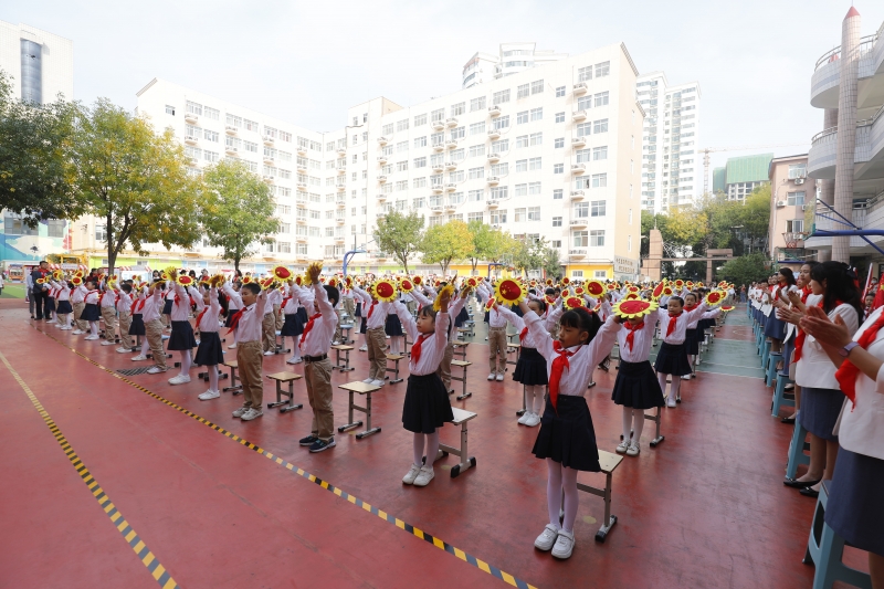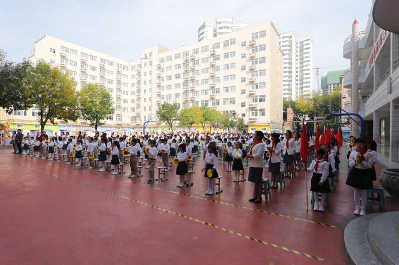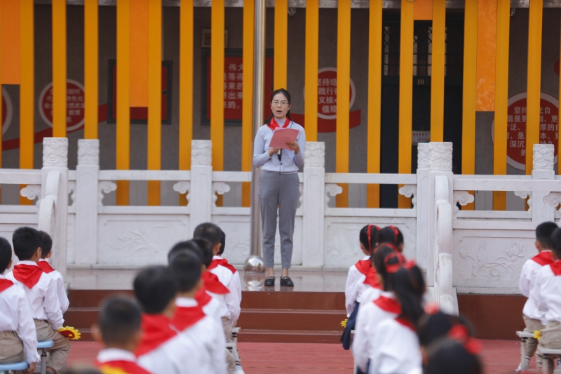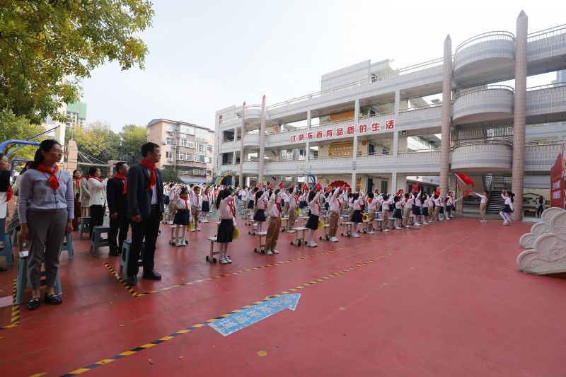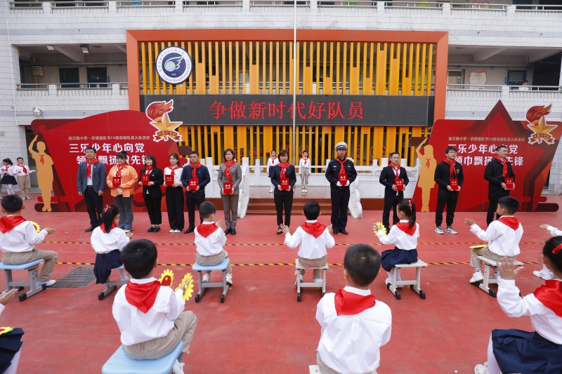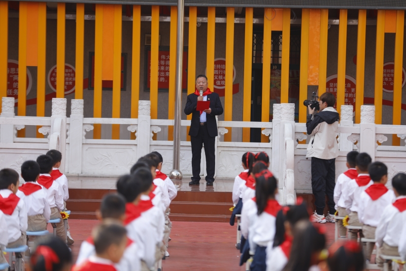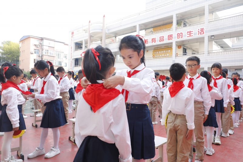 10月13日上午,鄭州市金水區經三路小學隆重舉(ju) 行“三樂(le) 少年心向黨(dang) 領巾飄揚做先鋒”新隊員入隊儀(yi) 式,慶祝中國少年先鋒隊建隊74周年。金水區高招辦主任曹鵬舉(ju) 、共青團金水區委副書(shu) 記沈季惠,金水區教育局教育科科長杜菁,金水區少先隊大隊總輔導員孔臻禕,金水區少先隊工作服務中心主任鄧銳方參加活動,全區100餘(yu) 名輔導員參與(yu) 了觀摩。