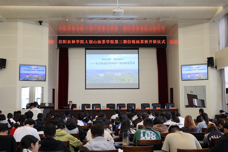 10月13日,大別山油茶學院在信陽農(nong) 林學院圖書(shu) 館六樓報告廳舉(ju) 行第三期信銳油茶班開班儀(yi) 式。信陽市政府機關(guan) 黨(dang) 組成員、市林業(ye) 和茶產(chan) 業(ye) 局黨(dang) 組成員、市油茶產(chan) 業(ye) 發展中心主任陳犁,副校長劉開華,市油茶產(chan) 業(ye) 協會(hui) 秘書(shu) 長陳廷森,市林科所副所長卜付軍(jun) ,學校相關(guan) 學院、部門負責人,大別山油茶學院教師代表及第三期油茶班全體(ti) 學員參加了開班儀(yi) 式。開班儀(yi) 式由大別山油茶學院副院長李蒙主持。