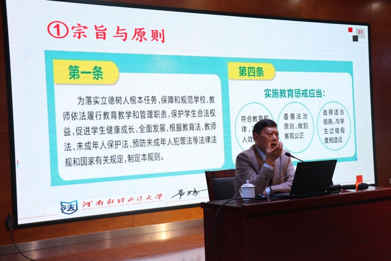 從(cong) 細節出發,以小事為(wei) 切入點,以小見大。蘇教授從(cong) 校園安全、事故責任以及風險應對三方麵入手,用生動形象的語言深入淺出地闡述了作為(wei) 教師應當如何預防應對和處理校園安全事故。同時,借鑒全國已發生的安全事故為(wei) 全體(ti) 教師敲響警鍾,希望大家從(cong) 校園實際出發,以史為(wei) 鑒,認真做好安全教育工作,進一步織牢織密校園安全網。教育有溫度,懲戒有尺度。蘇教授帶領全體(ti) 教師學習(xi) 了《中小學教育懲戒規則(試行)》。通過學習(xi) ,老師們(men) 深刻理解了《中小學教育懲戒規則(試行)》出台的背景和法律依據,教育懲戒的概念和適用範圍,以及對學生的哪些行為(wei) 可以實施教育懲戒,學校、教師可以采取哪些教育懲戒措施以及實施教育懲戒措施的注意事項。蘇教授引用實例,強調教師在教育教學管理、實施教育懲戒過程中的禁止性規定。