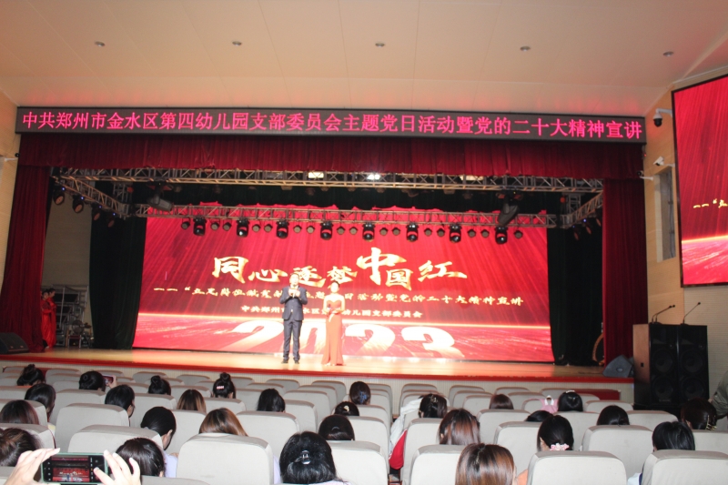 為(wei) 進一步學習(xi) 和貫徹黨(dang) 的二十大精神,弘揚紅色革命精神,加強中華優(you) 秀傳(chuan) 統文化的傳(chuan) 承與(yu) 發展,10月20日,鄭州市金水區第四幼兒(er) 園黨(dang) 支部開展了“同心逐夢中國紅 立足崗位做貢獻”主題黨(dang) 日暨黨(dang) 的二十大精神宣講活動。