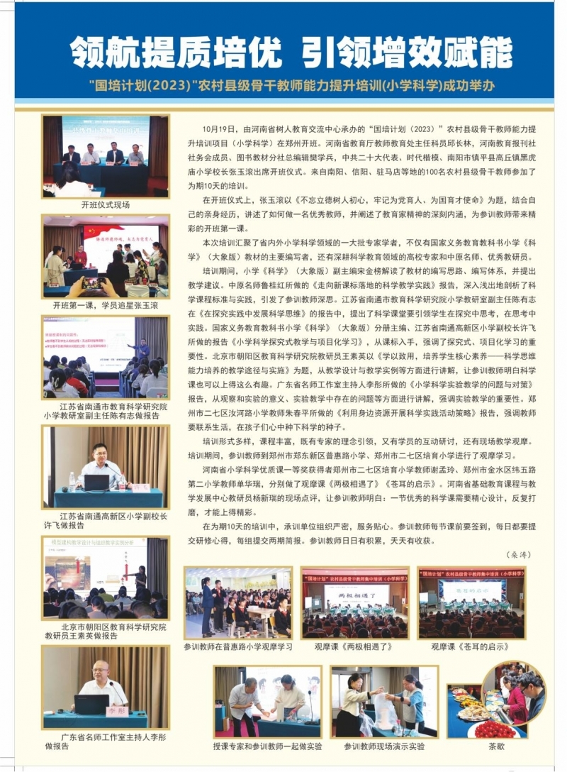 10月19日,由河南省樹人教育交流中心承辦的“國培計劃(2023)”農(nong) 村縣級骨幹教師能力提升培訓項目(小學科學)在鄭州開班。kaiyun体育登入口教師教育處主任科員邱長林,kaiyun体育全站网页版入口社務會(hui) 成員、圖書(shu) 教材分社總編輯樊學兵,中共二十大代表、時代楷模、南陽市鎮平縣高丘鎮黑虎廟小學校長張玉滾出席開班儀(yi) 式。來自南陽、信陽、駐馬店等地的100名農(nong) 村縣級骨幹教師參加了為(wei) 期10天的培訓。
