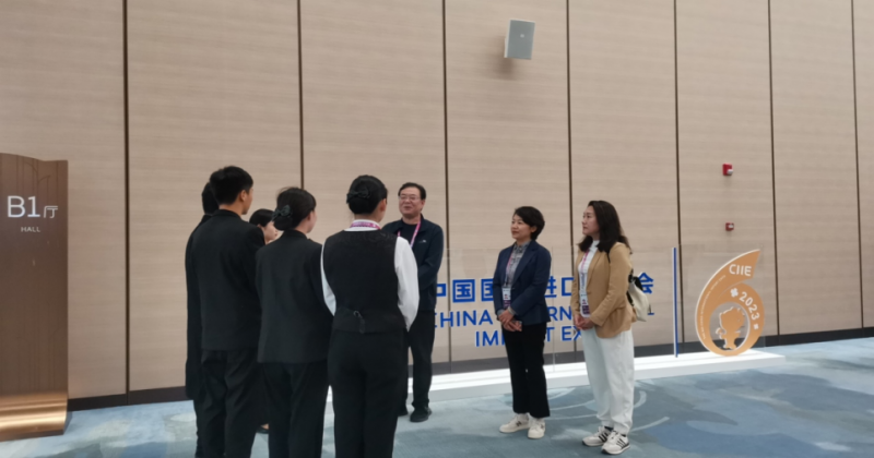 11月7日,平頂山職業(ye) 技術學院黨(dang) 委書(shu) 記丁永強、副院長邱軍(jun) 一行到進博會(hui) 現場,看望慰問來自該校旅遊與(yu) 酒店管理係的38名青年學生誌願者,並與(yu) 海南博鼇東(dong) 嶼島國家級旅遊度假區總經理沈霆開展交流座談。旅遊與(yu) 酒店管理係主任王新亞(ya) ,副主任李藍藍陪同參加。