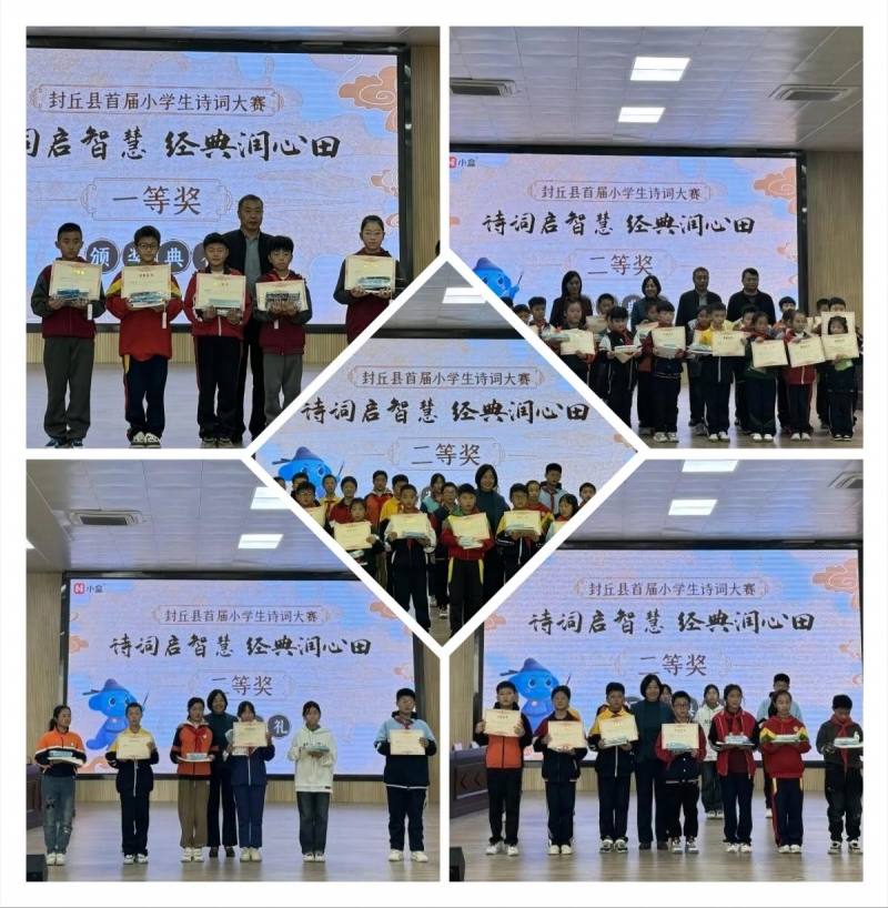 大賽分三個(ge) 階段進行。準備階段,老師采用線下指導練習(xi) 與(yu) 線上自主學習(xi) 的形式進行,以課內(nei) 古詩詞為(wei) 主,課外附加60首。第二階段為(wei) 初賽階段,各教育集團、直屬學校積極組織,在各學校掀起了學習(xi) 古典詩詞的熱潮。經過遴選,20個(ge) 教育集團、5所直屬學校共計180名小學生進入決(jue) 賽。經過激烈的角逐,本次比賽共有12名學生獲得一等獎,48名學生獲得二等獎,同學們(men) 充分展現了豐(feng) 厚的詩詞儲(chu) 備量、對古詩詞的熱愛和封丘少年的風采。