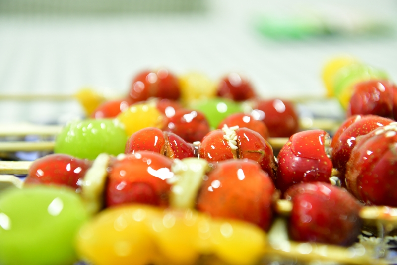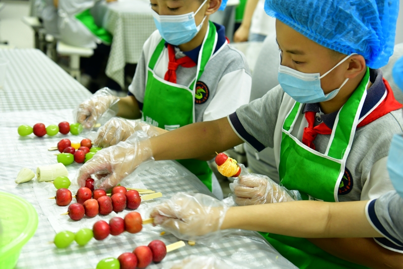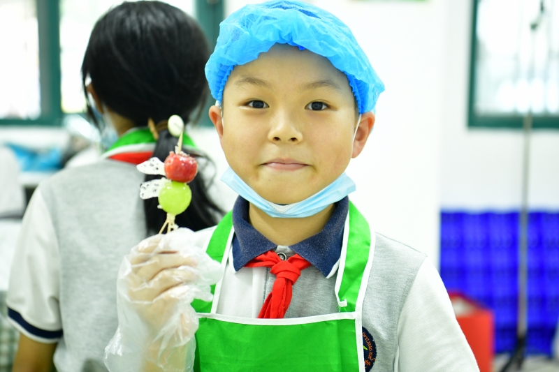 簡單的學習(xi) 後,便是學生們(men) 期盼已久的親(qin) 自實踐了。同學們(men) 將摘好的山楂、葡萄、橘子等水果一起清洗幹淨,切成大小合適的水果塊,根據自己的搭配靈感,用糖葫蘆簽子將不同水果塊串起來,不一會(hui) 兒(er) ,一串串色彩鮮豔的水果串就製作成了。
