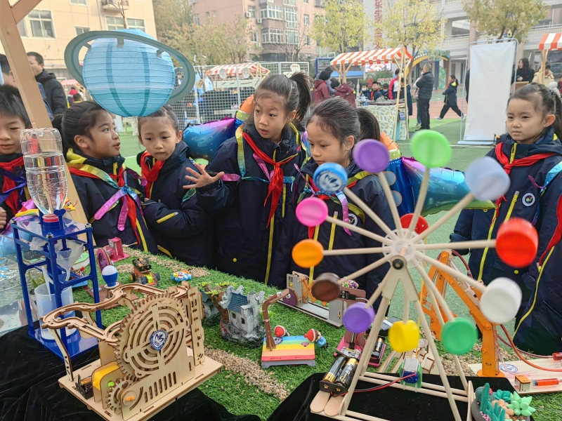 手工製作的天宮空間站模型、太陽能衛星模型、“可以撈一碗月光”的月球燈、裸眼3D風扇全息投影裝置、智能電子編鍾……11月15日上午,鄭州市金水區經三路小學校園廣場上熱鬧非凡,來自全區中小學校的“小科學家”們(men) 競相向參觀者介紹他們(men) “研發”的科技作品。