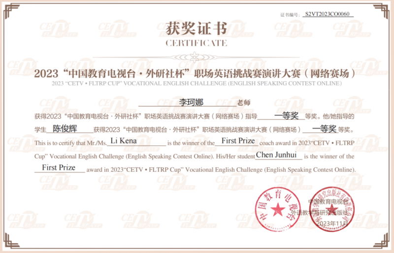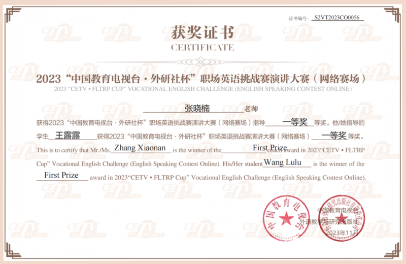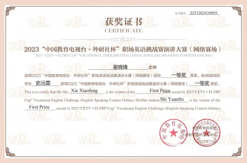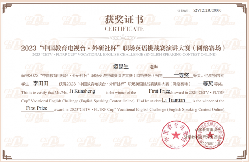 10月29日,“中國教育電視台·外研社杯”職場英語挑戰賽演講大賽網絡賽場決(jue) 賽落幕。平頂山職業(ye) 技術學院外語係22級普專(zhuan) 小學英語教育班李田田(指導教師:姬昆生)、22級普專(zhuan) 商務英語班文心雨(指導教師:劉新)、22級普專(zhuan) 音樂(le) 教育班陳俊輝(指導教師:李珂娜)、22級普專(zhuan) 小學教育班王露露(指導教師:張曉楠)和22級普專(zhuan) 小學教育班史沅霏(指導教師:謝曉鋒)榮獲一等獎。