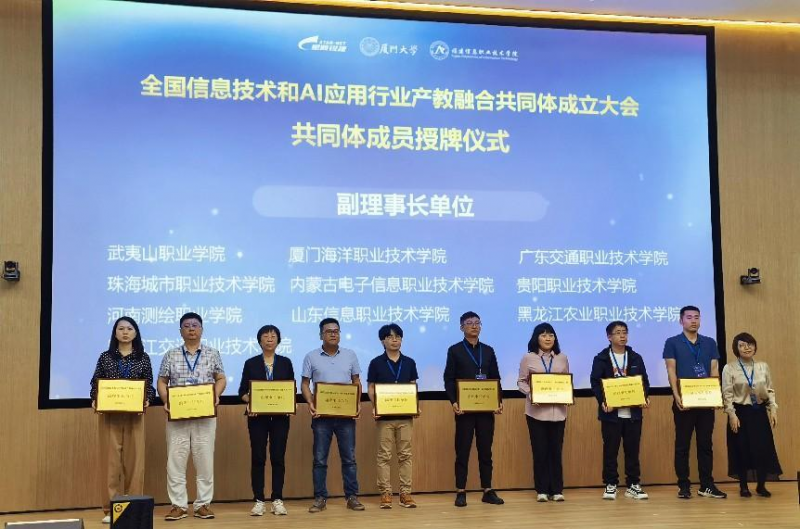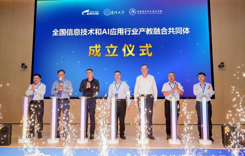 全國信息技術和AI應用行業(ye) 產(chan) 教融合共同體(ti) 由福建星網銳捷通訊股份有限公司、廈門大學、福建信息職業(ye) 技術學院共同發起成立。大會(hui) 以“數字融合、智創未來”為(wei) 主題,按照“平等互利、資源共享、合作共贏、共謀發展”的原則,共話職普融通、產(chan) 教融合、科教融匯,共建我國信息技術和AI應用創新領域的高素質技術技能人才新生態。