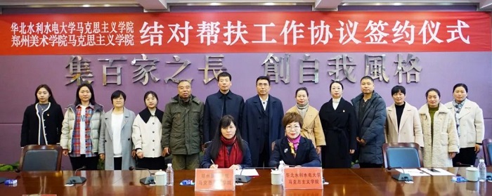 11月16日,為(wei) 落實《中共中央辦公廳、國務院辦公廳關(guan) 於(yu) 深化新時代學校思想政治理論課改革創新的若幹意見》精神,按照省委宣傳(chuan) 部、省委教育工委、省教育廳聯合下發的《關(guan) 於(yu) 開展馬克思主義(yi) 學院結對幫扶工作的通知》部署和要求,華北水利水電大學馬克思主義(yi) 學院和鄭州美術學院馬克思主義(yi) 學院舉(ju) 行結對幫扶工作簽約儀(yi) 式。華北水利水電大學馬克思主義(yi) 學院院長張梅、副院長賈兵強、副院長彭慧敏,鄭州美術學院校長石品、副校長楊鋼、副校長丁孝佳、教務處長張雪玲、馬克思主義(yi) 學院院長蔣蘭(lan) ,以及雙方學院班子成員和教師代表出席簽約儀(yi) 式。儀(yi) 式由鄭州美術學院副校長楊鋼主持。