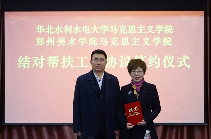 華北水利水電大學馬克思主義(yi) 學院院長張梅在致辭中從(cong) 學院概況、黨(dang) 的建設、思政課教學改革、學科建設等方麵介紹了學院基本情況,尤其重點分享了“三講四聯動”、“五個(ge) 一”大思政課新體(ti) 係、“尚德、鑒史、明理、築夢、強國”實踐教學品牌、“手拉手”集體(ti) 備課會(hui) 、“行走的思政課”等思政教學優(you) 秀案例。鄭州美術學院馬克思主義(yi) 學院院長蔣蘭(lan) 從(cong) 課程設置、學時落實、實踐教學及思政作品展等方麵進行了匯報。張梅院長與(yu) 蔣蘭(lan) 院長共同簽署《華北水利水電大學馬克思主義(yi) 學院和鄭州美術學院馬克思主義(yi) 學院結對幫扶工作協議》。