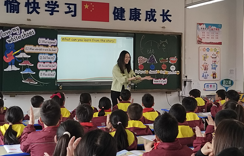 最後,錢亞(ya) 奇老師以全英教學的方式,為(wei) 學生講解了繪本《pete the cat》中的故事。她用生動有趣的方式,將圖畫、音樂(le) 和知識相結合,使得學生在輕鬆愉快的氛圍中學習(xi) 英語。她還通過互動問答、角色扮演等方式,激發了同學們(men) 的興(xing) 趣,使他們(men) 更加積極地參與(yu) 到課堂活動中。全英教學方式不僅(jin) 提高了學生的英語聽力,更讓他們(men) 在真實的語境中感受到了英語的魅力。