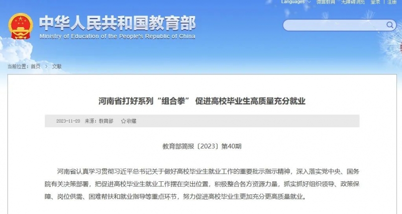河南省認真學習(xi) 貫徹習(xi) 近平總書(shu) 記關(guan) 於(yu) 做好高校畢業(ye) 生就業(ye) 工作的重要批示指示精神,深入落實黨(dang) 中央、國務院有關(guan) 決(jue) 策部署,把促進高校畢業(ye) 生就業(ye) 工作擺在突出位置,積極整合各方資源力量,抓實抓好組織領導、政策保障、崗位供需、困難幫扶和就業(ye) 指導等重點環節,努力促進高校畢業(ye) 生更加充分更高質量就業(ye) 。