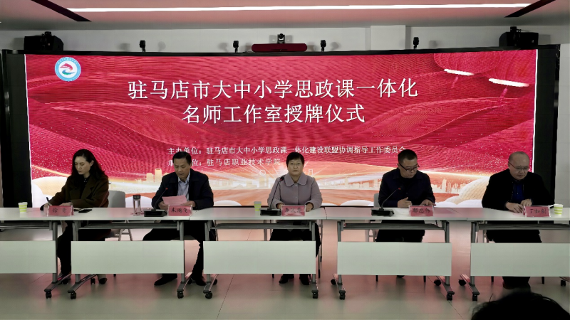 為(wei) 深入推進駐馬店市大中小學思政課一體(ti) 化建設,切實發揮思政課立德樹人關(guan) 鍵課程作用,11月24日,駐馬店市大中小學思政課一體(ti) 化名師工作室授牌儀(yi) 式暨思政課一體(ti) 化教學技能展示觀摩在駐馬店職業(ye) 技術學院大學生思想政治教育基地舉(ju) 行。駐馬店市大中小學思政課一體(ti) 化建設聯盟協調指導工作委員會(hui) 副主任、市教育局一級調研員鄢忠偉(wei) ,駐馬店市大中小學思政課一體(ti) 化建設聯盟協調指導工作委員會(hui) 秘書(shu) 長、黃淮學院黨(dang) 委宣傳(chuan) 部部長朱鴻飛,駐馬店市大中小學思政課一體(ti) 化建設聯盟協調指導工作委員會(hui) 副秘書(shu) 長、黃淮學院馬克思主義(yi) 學院院長丁如劍,駐馬店職業(ye) 技術學院校黨(dang) 委委員、副校長李鳳霞,黨(dang) 委宣傳(chuan) 統戰部部長徐青,馬克思主義(yi) 學院院長李菊蕾出席揭牌儀(yi) 式。擬授牌的17個(ge) 市大中小學思政課一體(ti) 化名師工作室負責人,進入思政課一體(ti) 化教學技能展示大賽決(jue) 賽的12名思政課教師參加揭牌儀(yi) 式。