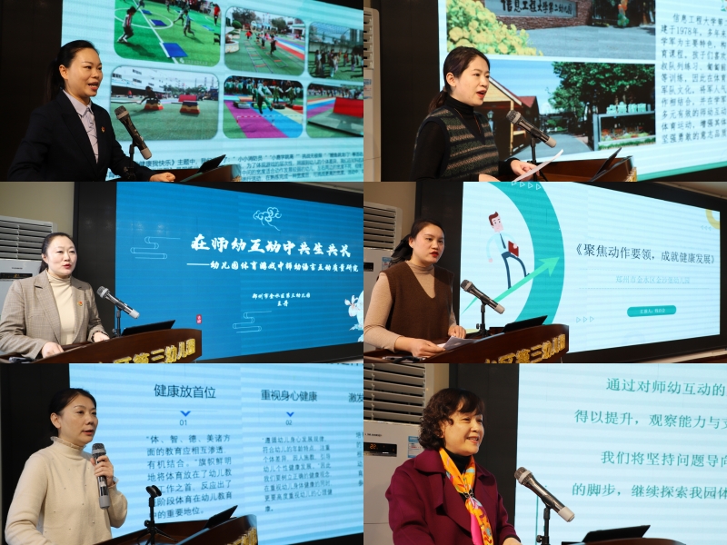 經過前期十八個(ge) 聯盟組和區級中心教研組的評審與(yu) 推選,本次活動共有六位老師進行經驗分享交流,分別是河南省省直機關(guan) 第一幼兒(er) 園呂文靜老師《入學準備教育背景下提升體(ti) 育教學活動質量》;中國人民解放軍(jun) 信息工程大學第二幼兒(er) 園李東(dong) 陽老師《多元師幼互動,促高質量發展》;金水區第三幼兒(er) 園王丹老師《幼兒(er) 園體(ti) 育遊戲中師幼語言互動質量研究》;金水區金沙堡幼兒(er) 園錢百會(hui) 老師《聚焦動作要領,成就健康發展》;鄭州市教工幼兒(er) 園王向青老師《以“跑酷”為(wei) 例談體(ti) 育活動中的師幼互動策略》;河南省實驗幼兒(er) 園王霞老師《幼兒(er) 園晨間自主體(ti) 育遊戲中高質量師幼互動的實踐》。