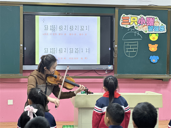音樂(le) 教研組長葛歌老師帶去音樂(le) 欣賞課《三隻小豬》。葛老師用小提琴演奏主題旋律,帶領孩子們(men) 快樂(le) 律動,開啟美好音樂(le) 之旅。葛老師依據新課標,通過唱遊方式,激發學生想象與(yu) 聯想,引導學生把課堂上的感受和見解,進行獨立編創,合作探索,為(wei) 孩子們(men) 帶來豐(feng) 富有趣又獨特的音樂(le) 體(ti) 驗。