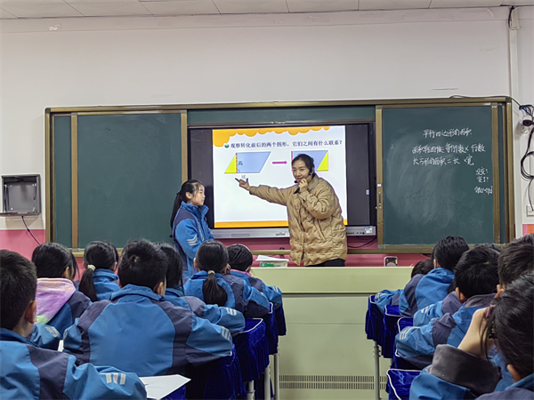 五年級數學教研組長齊東(dong) 曉老師送教《平行四邊形的麵積》一課,從(cong) 整體(ti) 把握教學內(nei) 容,不斷啟發和引導學生自主思考進行教學,通過合作、交流、反思等學習(xi) 方式,在實踐活動中感悟平行四邊形麵積的計算方法。整節課以學生為(wei) 主體(ti) ,鼓勵學生大膽展示自我,環環相扣,循序漸進,孩子們(men) 在老師引導下,體(ti) 會(hui) 知識產(chan) 生的過程,借助轉化數學思想,用已有知識經驗解決(jue) 新的數學問題,收獲滿滿。