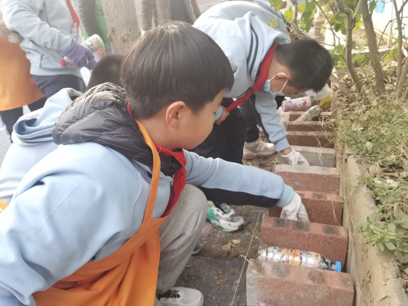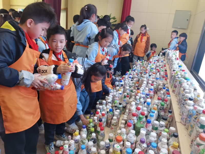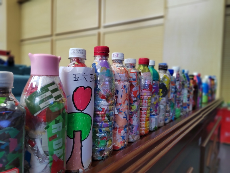 活動籌備階段,孩子們(men) 在輔導老師們(men) 的幫助下,嚐試利用廢舊礦泉水瓶和廢棄塑料製品製作“生態磚”。在交流階段,每個(ge) 班派代表帶來了自己做的“生態磚”,並在“生態磚”身上貼好了姓名、班級、重量。誌願者老師們(men) 對這些“生態磚”進行了檢查驗收,組織學生開展評優(you) 工作。