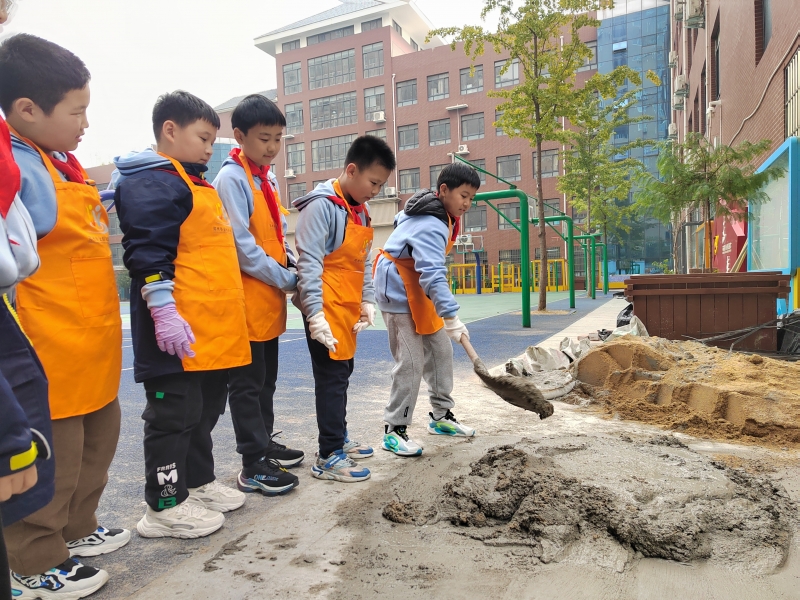 活動啟動儀(yi) 式結束後,孩子們(men) 按照不同的分工。“小蜜蜂組”、“小螞蟻組”負責搬運“生態磚”和水泥,“小巧匠組”、“小美工組”負責水泥的攪拌、花壇牆體(ti) 的搭建和美化。隨後“小蜜蜂組”、“小螞蟻組”一起將製作好的“生態磚”運送至施工場地。到了施工現場,孩子們(men) 發現搬運成袋的“生態磚”、攪拌水泥、砌花壇圍牆……這些看似好玩的事,真正幹起來,卻沒有一件事是容易的。