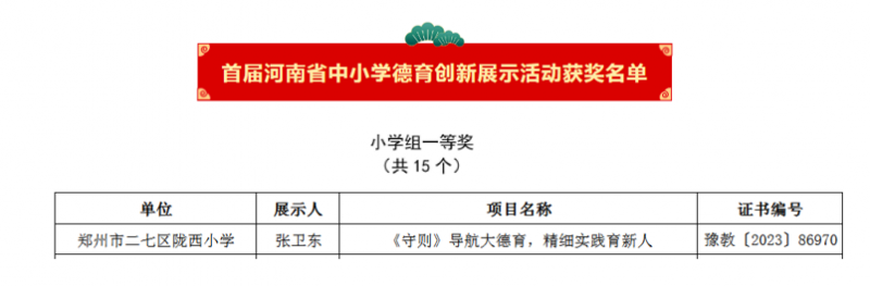 11月28日,據kaiyun体育登入口公布的首屆河南省中小學德育創新展示活動獲獎名單,鄭州市二七區隴西小學教育集團德育創新項目《<守則>導航大德育,精細實踐育新人》榮獲首屆河南省中小學德育創新展示活動小學組一等獎。