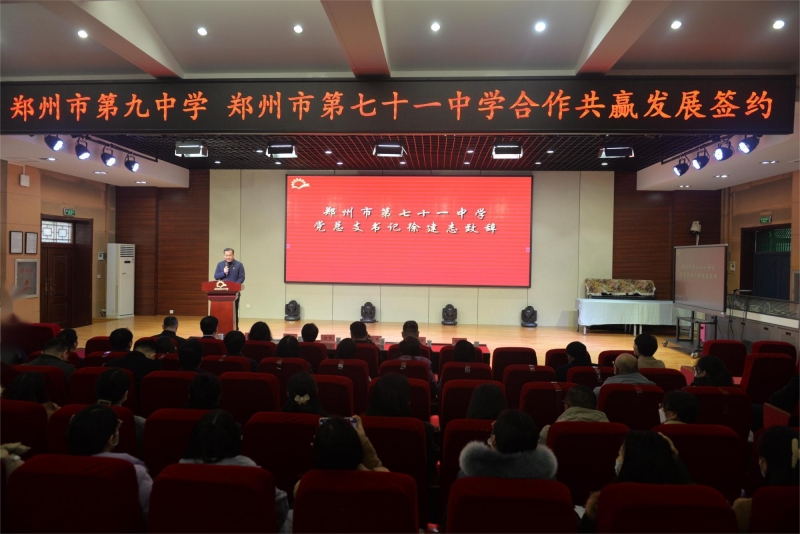為(wei) 深化教育綜合改革,充分發揮優(you) 質教育資源輻射引領作用。12月6日,鄭州市第九中學、鄭州市第七十一中學合作共贏發展簽約暨“鄭州九中教育集團七十一中校區”揭牌儀(yi) 式在鄭州市第七十一中學隆重舉(ju) 行。鄭州市第九中學校長張瑩、副校長陳曉,金水區教育局黨(dang) 組專(zhuan) 職副書(shu) 記田彩霞,金水區南陽路街道黨(dang) 工委書(shu) 記吳昊,鄭州市公安局金水分局南陽路派出所所長曾維田,金水區高招辦主任曹鵬舉(ju) 等相關(guan) 領導,以及鄭州市第七十一中學領導班子和師生家長代表共60餘(yu) 人參加儀(yi) 式。