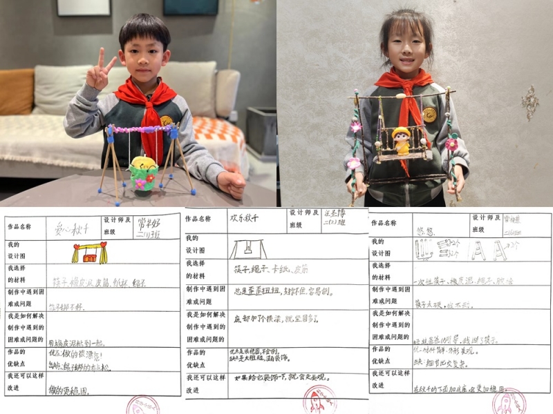 二年級的“小工程師”利用身邊的材料,繪製設計圖並完成了秋千的製作。