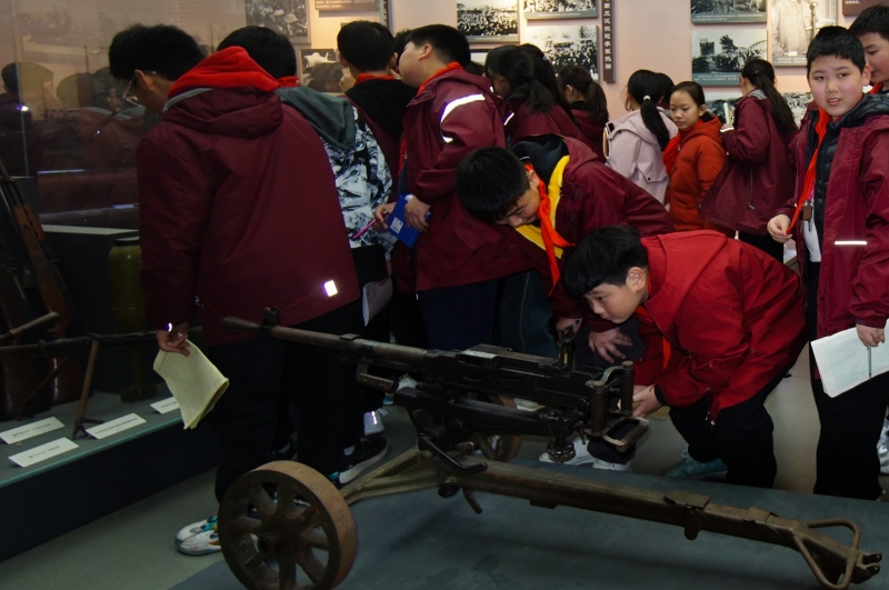 到了二樓,同學們(men) 踏入中華民族飽受屈辱但又頑強鬥爭(zheng) 的近代史,每幅承載著革命硝煙的曆史照片、每段彌足珍貴的文字,每件破舊不堪的槍械武器都蘊藏著一種不屈不撓的民族精神,帶孩子們(men) 共同見證改革強軍(jun) 的進程。