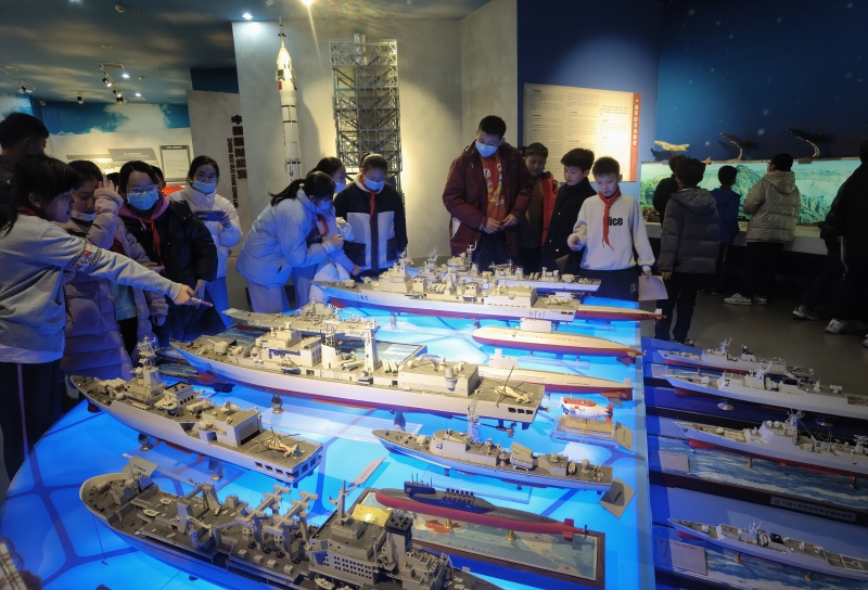在三樓展廳,同學們(men) 見識到了我國軍(jun) 事國防的強大,一座座高大逼真的神州飛船、航空母艦、飛機、坦克、潛水器等使孩子們(men) 驚歎不已。