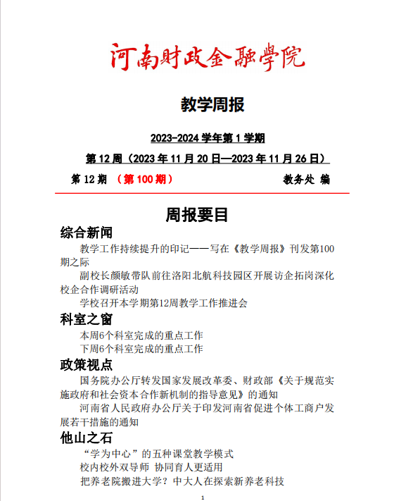 2023年11月26日,河南財政金融學院教務處刊發本學期第12周《教學周報》,是自2021年3月5日刊發《教學周報》(2020-2021學年第2學期第1周)以來的第100期。100期《教學周報》總字數達到309.9萬(wan) 字,是學校教學工作貫徹OBE教育理念、持續提升教學質量的深刻印記。