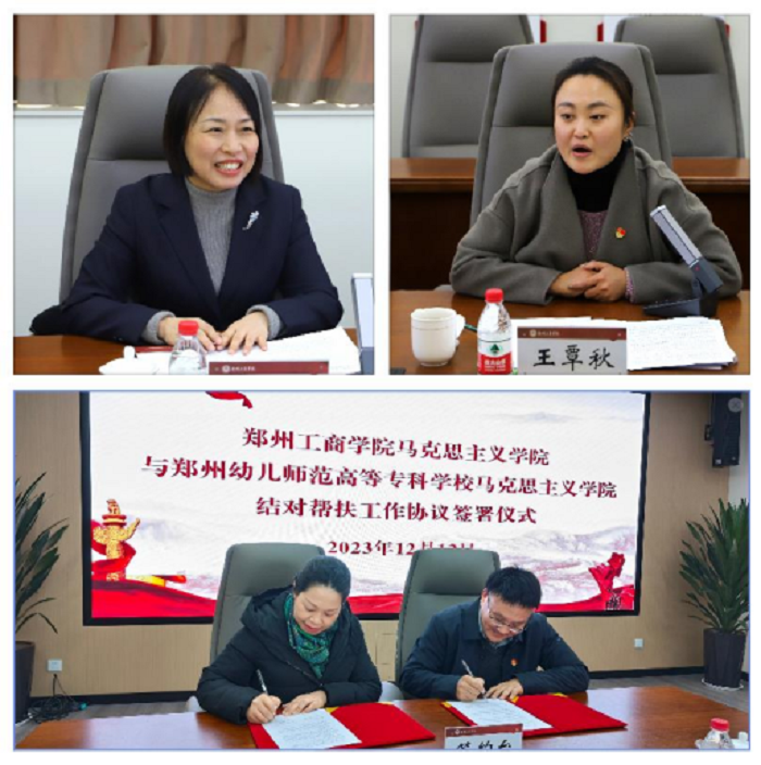 為(wei) 持續貫徹落實全國全省高校思想政治工作會(hui) 議、全國全省教育大會(hui) 和學校思想政治理論課教師座談會(hui) 等相關(guan) 會(hui) 議精神,探索構建校際合作、資源共享的“大思政課”育人格局,12月12日下午,鄭州幼兒(er) 師範高等專(zhuan) 科學校馬克思主義(yi) 學院與(yu) 鄭州工商學院馬克思主義(yi) 學院在鄭州工商學院舉(ju) 行了“結對幫扶共建”簽約儀(yi) 式。鄭州工商學院副書(shu) 記、副校長王覃秋,鄭州幼兒(er) 師範學校紀委書(shu) 記劉蕤出席並參加了簽約儀(yi) 式。簽約儀(yi) 式由鄭州工商學院馬克思主義(yi) 學院院長程明欣主持。