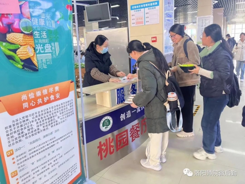 活動采用“主場活動+重點活動+主題日”方式全麵推進。在四個(ge) 餐廳開展“光盤踐行,洛師行動”文明倡導活動,為(wei) 同學們(men) 送去果蔬和酸奶;製作“美好‘食’光,安全伴行,營養(yang) 普及,健康你我”活動打卡卡片,學生集齊包括食品安全、節約糧食等八種不同的知識卡片,即可領取洛師文創產(chan) 品一份;以“‘食’刻在心間,監‘測’保安全”為(wei) 主題開展食品檢測室一日遊體(ti) 驗活動,真實、公開向學生展示學校食品安全真實情況;借助電子屏、展板展架、條幅等宣傳(chuan) 媒介,多渠道寬途徑向師生普及食品安全及反食品浪費知識,營造人人關(guan) 注、支持、參與(yu) 食品安全、反對浪費的濃厚氛圍。