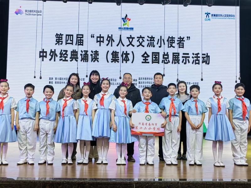 12月15日—17日,在全國第四屆“中外人文交流小使者”中外經典誦讀集體(ti) 總展示中,南陽市兩(liang) 所學校代表河南省在全國總決(jue) 賽中獲得佳績。南陽市第十二小學中文原創朗誦作品《習(xi) 爺爺來到我們(men) 南陽》和外文配音作品《音樂(le) 之聲》榮獲全國一等獎,南陽市第八小學中外文朗誦《四季詩韻》榮獲二等獎,南陽市教育局榮獲優(you) 秀組織獎。