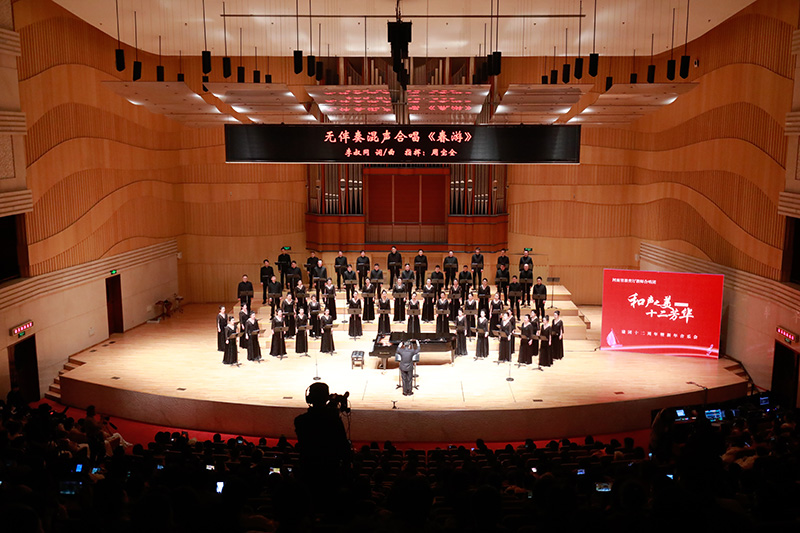 演繹和聲之美,盡顯時代芳華!12月27日晚,在河南藝術中心音樂(le) 廳內(nei) ,天籟之音縈繞,觀眾(zhong) 掌聲不斷,“和聲之美 十二芳華——kaiyun体育登入口教師合唱團慶祝建團十二周年暨新年音樂(le) 會(hui) ”在一首《太陽最紅毛主席最親(qin) 》大合唱中圓滿落下帷幕。省教育廳有關(guan) 領導出席並觀看演出,多名國內(nei) 知名指揮家、音樂(le) 家蒞臨(lin) 音樂(le) 會(hui) 現場。