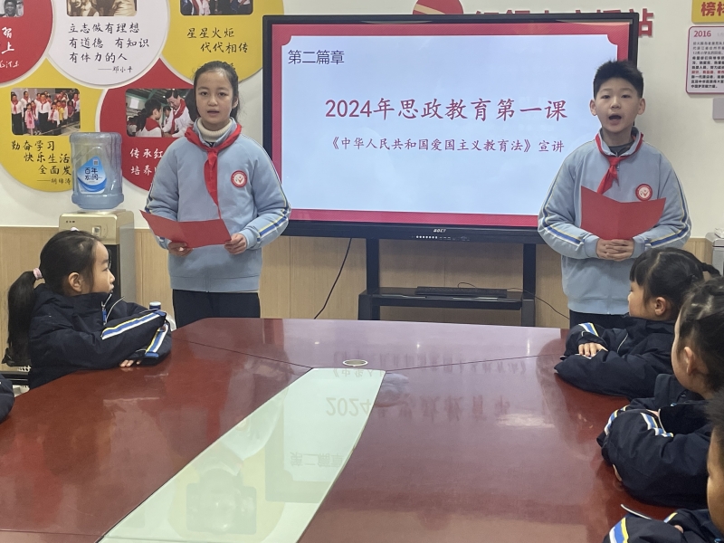 活動伊始,奏唱國歌。全校師生以2024年思政第一課——《中華人民共和國愛國主義(yi) 教育法》的學習(xi) 拉開帷幕。宣講人為(wei) 河南省少先隊紅領巾講解員六一中隊孫若晴和六五中隊張謹恩。愛國主義(yi) 是中華民族精神的核心,是中華民族團結奮鬥、自強不息的精神紐帶。金水區文化路第二小學秉持“興(xing) 德礪誌 奮發有為(wei) ”的辦學理念,聚焦立德樹人根本任務,全麵推進“大思政課”建設。推動思政小課堂與(yu) 社會(hui) 大課堂相結合、各類課程與(yu) 思政課同向同行,教育引導學生堅定“四個(ge) 自信”,成為(wei) 堪當民族複興(xing) 重任的時代新人。