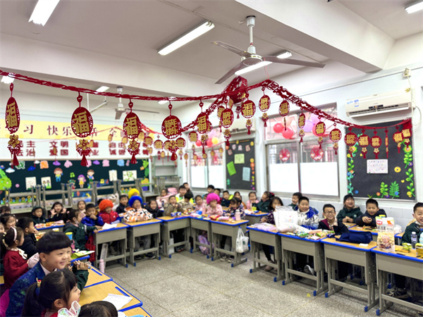 五彩繽紛的氣球和彩帶將學校各班級裝飾一新,同學們(men) 精心準備的節目更讓人目不暇接。雖值寒冬,但各班氣氛熱烈。在正副班主任的細致組織下,同學們(men) 精心準備形式多樣的文藝節目,活動中穿插趣味十足的遊戲,孩子們(men) 熱情高漲,各顯神通,充分展示各自才藝特長:有優(you) 美動聽的歌唱,有令人捧腹大笑的小品,還有精彩絕倫(lun) 的器樂(le) 演奏、手寫(xie) 春聯……整場活動,各班級掌聲雷動,愉悅的笑聲彌散在整個(ge) 校園。