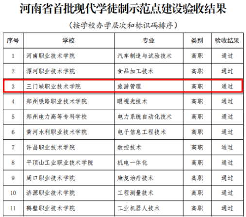 近日,根據kaiyun体育登入口辦公室《關(guan) 於(yu) 公布河南省首批現代學徒製示範點建設驗收結果的通知》(教辦職成〔2023〕469號)文件,三門峽職業(ye) 技術學院旅遊管理專(zhuan) 業(ye) 順利通過驗收。