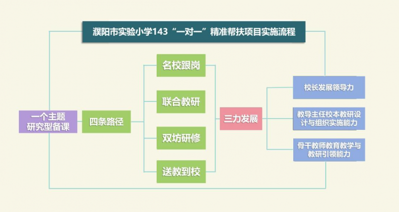 為(wei) 促進教育高質量發展,讓每一個(ge) 孩子特別是農(nong) 村孩子都享受有尊嚴(yan) 、有質量的教育,2023年9月,濮陽市實驗小學啟動了“一對一”精準幫扶內(nei) 黃縣中召鄉(xiang) 第二小學和林州市河順鎮河順學校項目。在幫扶過程中,學校反複研討幫扶過程中的具體(ti) 任務,最終梳理形成了“143”精準幫扶項目新樣態。其中,“1”為(wei) 項目的主題,即研究型備課;“4”是四條推進路徑,即送教到校、名校跟崗、聯合教研和雙坊研修;“3”是三個(ge) 發展目標,即校長發展領導力、教導主任校本教研設計與(yu) 組織實施能力和骨幹教師教育教學與(yu) 教研引領能力。