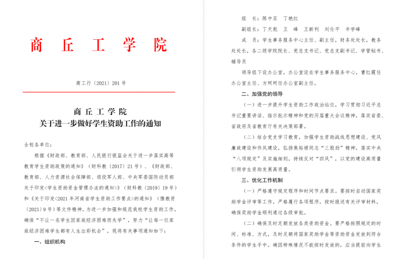 提增資助“暖情”精度。為(wei) 切實做好國家助學金、學校助學金的精準發放工作,學校學生資助管理中心全麵排查原建檔立卡學生(脫貧家庭學生、脫貧不穩定家庭學生)、邊緣易致貧家庭學生、突發嚴(yan) 重困難家庭學生、城鄉(xiang) 低保學生、低保邊緣人口、特困救助學生、支出型困難家庭學生、其他低收入家庭學生、孤兒(er) 學生、事實無人撫養(yang) 兒(er) 童、家庭經濟困難殘疾學生、烈士子女、殘疾人子女等特殊困難群體(ti) ,並做好了原建檔立卡學生資助政策的接續,確保原建檔立卡學生享受資助政策。同時,在黨(dang) 委副書(shu) 記王峰的組織下,組織學生資助管理中心、各書(shu) 院人員對《商丘工學院國家助學金量化指標體(ti) 係》進行了細化修改,修改後的量化指標體(ti) 係更結合實際,更利於(yu) 對家庭經濟困難學生進行精準資助。
