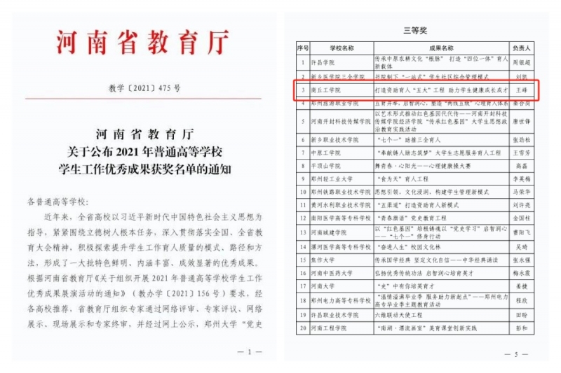 辛勤耕耘結碩果,資助育人展成效。在資助育人“六心”工程的具體(ti) 實踐中,學校的學生資助工作取得了一些成績。學校《資助育人先育心》學生工作成果榮獲2018全國民辦高校學生工作創新二等獎;在河南省普通高等學校第三屆“大美學工”評選活動中,學校參評的《打造“五引領三育人(資助育人是‘三育人’之一)”學生工作矩陣,促進學生健康成長成才》被評為(wei) “十佳優(you) 秀學生工作品牌”;《打造資助育人“五大”工程 助力學生健康成長成才》項目榮獲2021年普通高等學校學生工作優(you) 秀成果獎;學校在河南省高校2021、2022年度學生資助工作績效評價(jia) 中獲評“優(you) 秀”等級;學校資助人員發表了《高校學生資助工作麵臨(lin) 的難點》、《公益誌願服務活動融入高校資助育人工作的方法研究》等30餘(yu) 篇論文,舉(ju) 行的“誠信校園行”校園短劇大賽、暑假走訪經濟困難學生等189個(ge) 活動被省市級媒體(ti) 報道,受助學生代表——援建洛陽“小湯山”的任林濤、被鄧州市公安局民警親(qin) 切譽為(wei) 鄧州公安編外“空中衛士”的陳雲(yun) 龍和張鵬飛等人的事跡分別被中國大學生在線、河南教育網報道。
