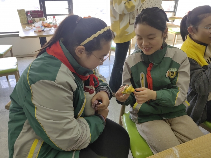 學生滿心期待的環節到了——製作花饃。教師把學生分為(wei) 若幹勞動小組,分工合作,在專(zhuan) 業(ye) 人員的指導下和麵、揉麵、造型、裝飾,從(cong) 一道道工序中不斷嚐試、調整,力求製作出最滿意的花饃。之後,各小組進行創意花饃大比拚,評選出最佳創意獎和勞動小能手。當親(qin) 手製作的花饃被熱氣騰騰地端出來時,師生欣賞並品嚐自己的勞動成果,氣氛熱烈。
