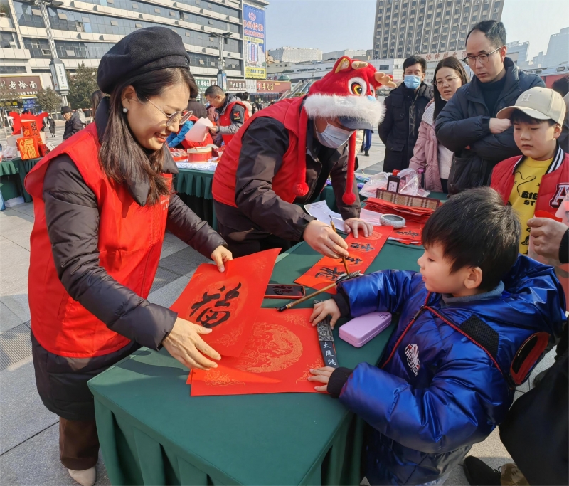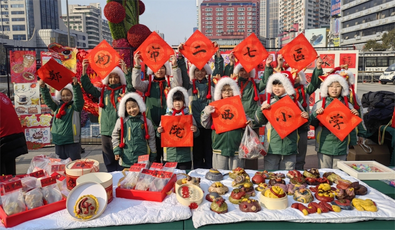 在一片喜慶的中國紅中,鄭州市二七區隴西小學的迎新年美術作品展吸引了許多旅客駐足觀賞。作品展之外,經過包裝的花饃、學生扭扭棒作品,以及隴西教師親(qin) 手書(shu) 寫(xie) 的福字對聯,也吸引了過往行人的興(xing) 趣。