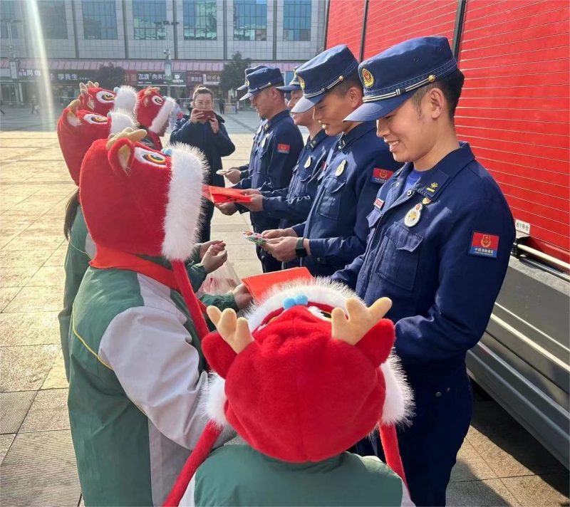 廣場不遠處,小“隴”人們(men) 也將新年的祝福送到消防戰士手中,他們(men) 是鄭州市消防救援支隊火車站大隊的消防人員。小“隴”人還化身小小消防宣講員,分發消防手冊(ce) ,給身邊的行人宣講消防安全知識,使現場氣氛達到高潮。