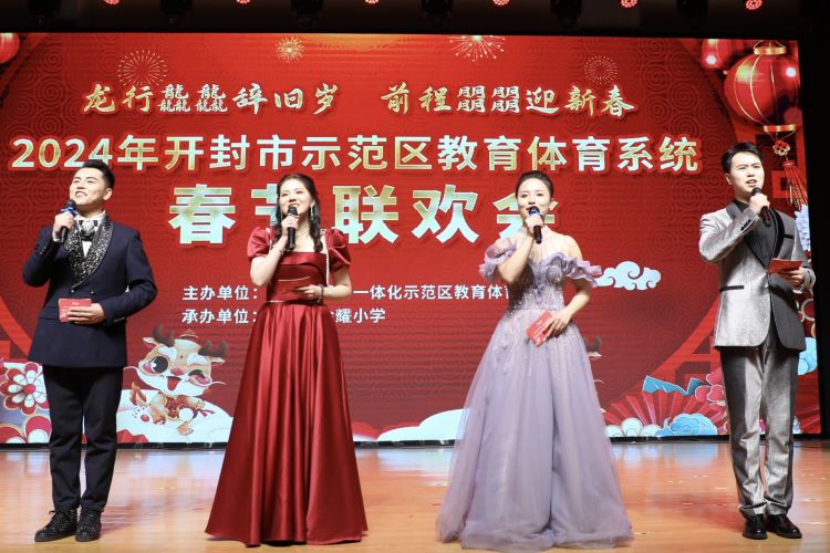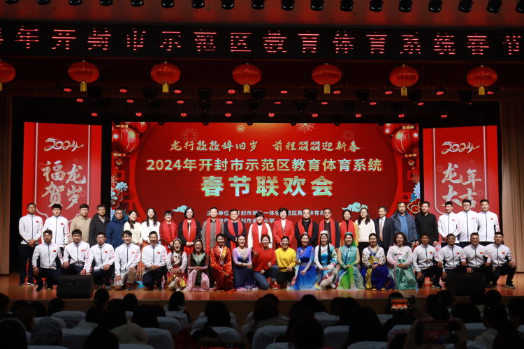 一元複始,萬(wan) 象更新。2024年2月1日下午,“龍行龘龘辭舊歲 前程朤朤迎新春”2024年開封市示範區教育體(ti) 育係統春節聯歡會(hui) 在金耀小學隆重舉(ju) 行,現場張燈結彩,洋溢著濃濃的年味兒(er) 。示範區黨(dang) 工委委員、宣傳(chuan) 部部長王誌英,示範區三級調研員李麗(li) ,示範區黨(dang) 工委統戰部常務副部長王俊濤,示範區教體(ti) 局黨(dang) 組書(shu) 記、局長聶愛軍(jun) ,示範區文化和旅遊局局長高紀武及示範區教體(ti) 局全體(ti) 班子成員同教體(ti) 係統近千名教職工歡聚一堂,共同迎接新春佳節的到來。