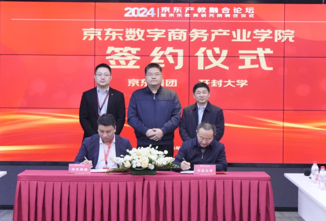 2月1日上午,開封大學與(yu) 京東(dong) 集團共建“鄉(xiang) 村振興(xing) 產(chan) 業(ye) 學院”簽約儀(yi) 式在京東(dong) 集團總部隆重舉(ju) 行。京東(dong) 集團副總裁馮(feng) 全普、京東(dong) 教育研究院院長孫建、京東(dong) 零售教育大客戶部校企合作負責人喬(qiao) 治,開封大學校長王德如、副校長李治等出席儀(yi) 式。