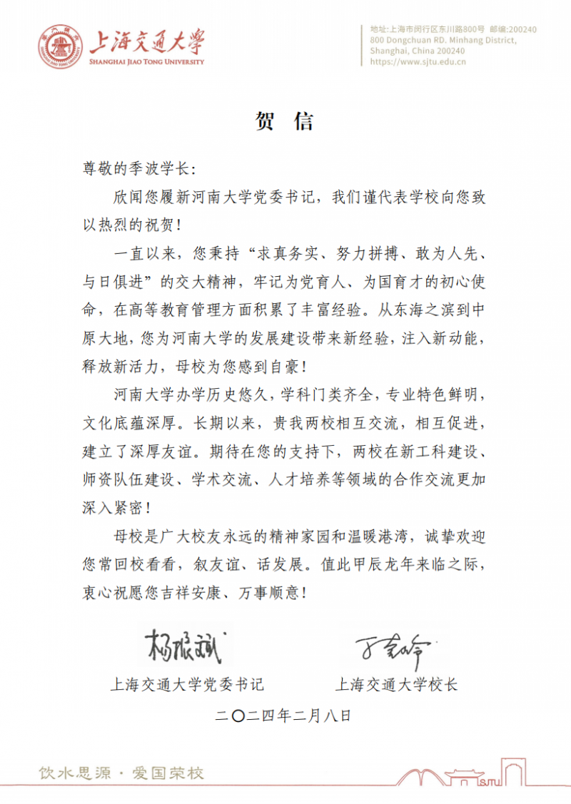 近日,一封來自上海交大的信送到了河大。信中,上海交大黨(dang) 委書(shu) 記楊振斌、校長丁奎嶺對校友季波為(wei) 河大的發展建設帶來新經驗、注入新動能、釋放新活力感到自豪!期望兩(liang) 校共敘友誼,在新工科建設、師資隊伍建設、學術交流、人才培養(yang) 等領域的合作交流更加深入緊密!