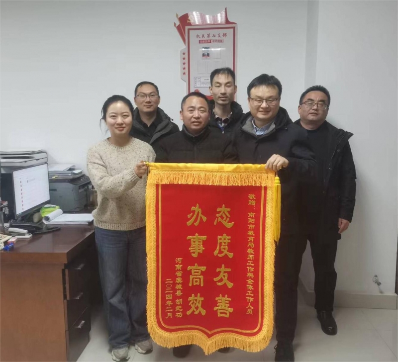“你們(men) 態度友善、辦事高效,避免了我來回奔波,非常感謝你們(men) !”2月21日,一名外地教師把寫(xie) 著“態度友善 辦事高效”的錦旗雙手遞給南陽市教育局教師工作科科長張玉蕾手中時,激動之情難於(yu) 言表。